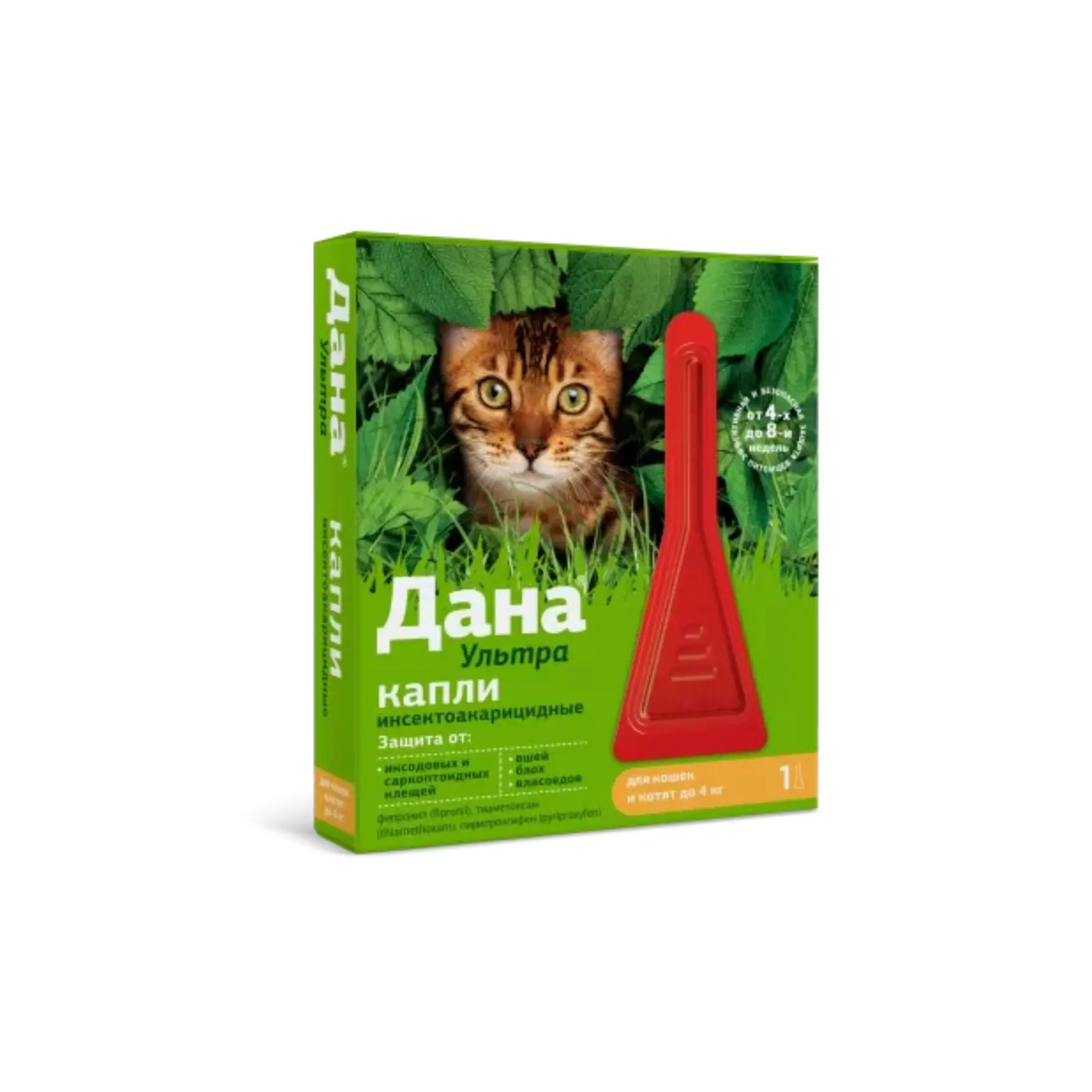 DANA Ultra insectoacaricidal drops are applied to the back of the cat’s neck to provide extended protection against ectoparasites. The enhanced formula is effective even against resistant fleas, ticks, and lice, breaking their life cycle to prevent reinfestation.