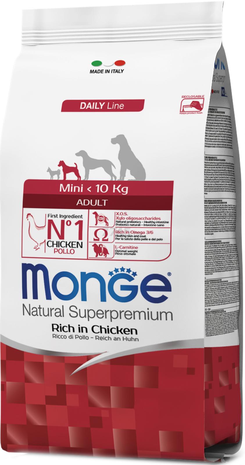 Dry dog food MONGE Mini Adult 15 kg chicken is a complete, balanced diet for adult small breed dogs with normal physical activity.