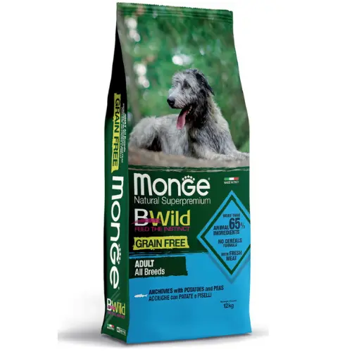 Bwild Grain Free is a balanced and complete food for adult dogs of all breeds. Made with anchovy meat, a highly digestible and biologically valuable protein source. Contains 65% meat, offering a high protein content with a limited amount of carbohydrates. Omega-3 and Omega-6 fatty acids help maintain healthy skin and a shiny coat. Glucosamine, chondroitin, calcium, and phosphorus support joint health and proper musculoskeletal function. XOS (Xylo-oligosaccharides) help maintain a healthy intestinal microflora and promote optimal nutrient absorption.