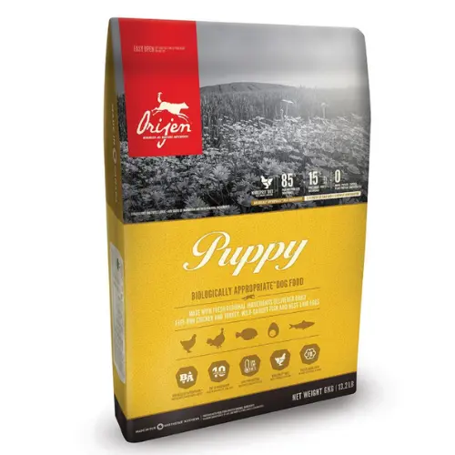 ORIJEN PUPPY dry food is specially crafted to meet the natural dietary needs of puppies. It is made with fresh chicken, turkey, fish, and eggs. The formula contains 85% quality meat, 15% vegetables and fruits, and 0% grains or potatoes. Rich in 38% high-quality protein and 17% low-glycemic carbohydrates, it supports healthy growth, muscle development, and sustained energy. The food contains no artificial flavorings or enhancers—the natural taste and aroma come from chicken and duck liver 🦴✨