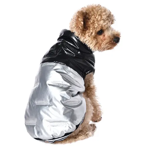 Stylish insulated dog cape made of shiny fabric in silver and black design 🪩❄️