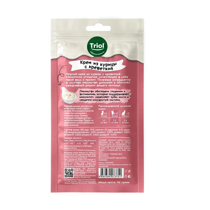 A tender, creamy treat made with chicken and shrimp, Triol SNACK BAR is a gourmet snack your cat will crave.