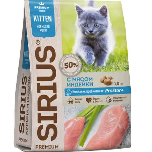 SIRIUS չոր կեր կատվի ձագերի համար՝ հավի և հնդկահավի մսով, ապահովում է կատվի առողջ աճը և զարգացմանն անհրաժեշտ բոլոր սննդարար նյութերը։ Սննդակարգը հարստացված է վիտամիններով և հանքանյութերով, ամրապնդում է իմունիտետը, աջակցում մարսողության և մաշկի, մազերի առողջությանը։ Կերն ապահովում է էներգիա ակտիվ ու խաղալի կատուների համար և հեշտ է մարսվում։ 🐱🥣