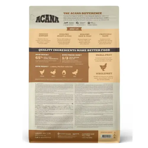 ACANA Homestead Harvest մշակվել է հասուն կատուների համար՝ FEDIAF-ի կողմից սահմանված սննդային չափանիշներին համապատասխան։ Կերը պարունակում է հավի, հնդկահավի և բադի միս, ապահովելով բարձր սպիտակուցային արժեք և համտեսելիություն 🐾💛
