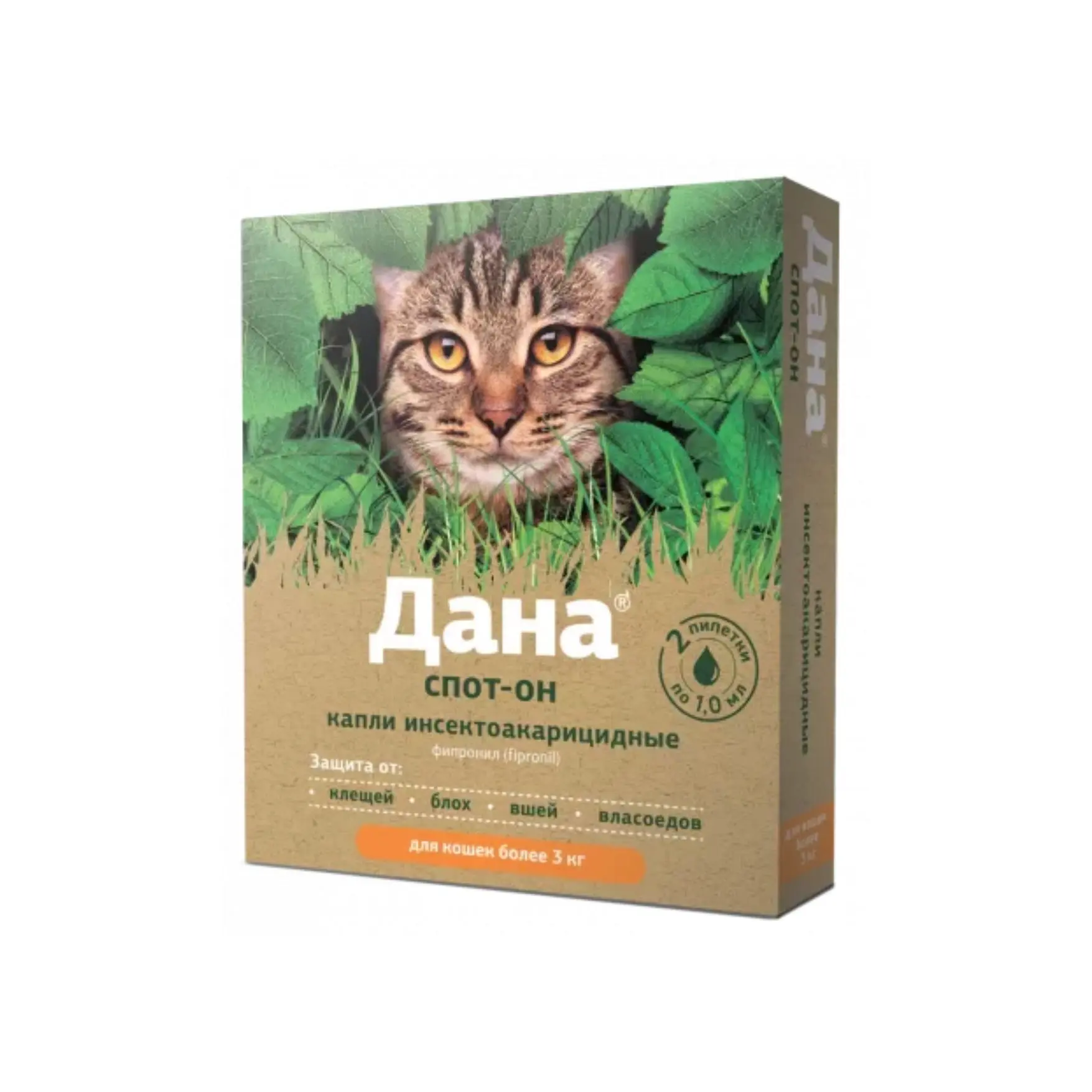 Դանա Սպոտ-Օն կաթիլները բարձր արդյունավետությամբ միջոց են՝ նախատեսված մսակեր կենդանիների, հատկապես՝ 3 կգ-ից բարձր քաշով կատուների համար։ Դրանք պայքարում են արտաքին մակաբույծների դեմ՝ ներառյալ տզերը, բլոճները, լվերը