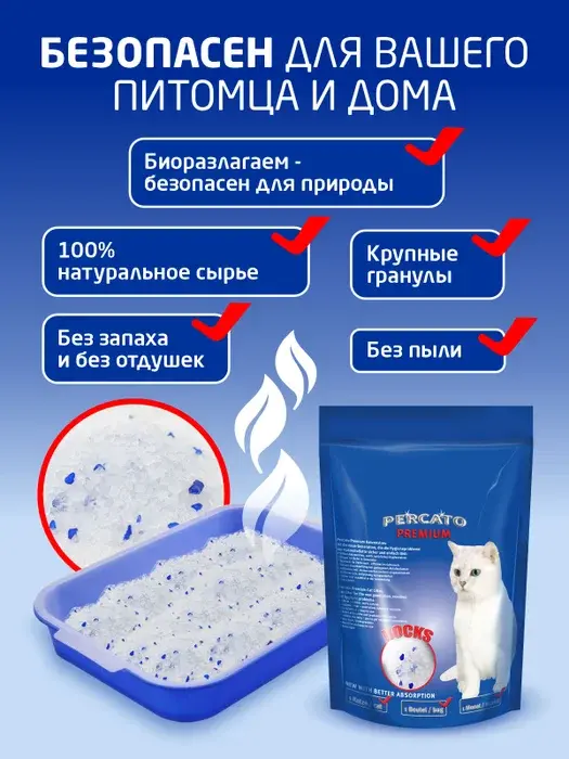 Percato-ի 10 լ լցանյութը պատրաստված է բարձրորակ բնական բաղադրիչներից։ Այն շատ արագ ներծծում է խոնավությունը և արդյունավետորեն նետրալիզացնում է տհաճ հոտերը։ Գրանուլները՝ մխրճվելով հեղուկում, ձևավորում են ամուր կլորակներ, որոնք հեշտությամբ կարելի է հեռացնել։