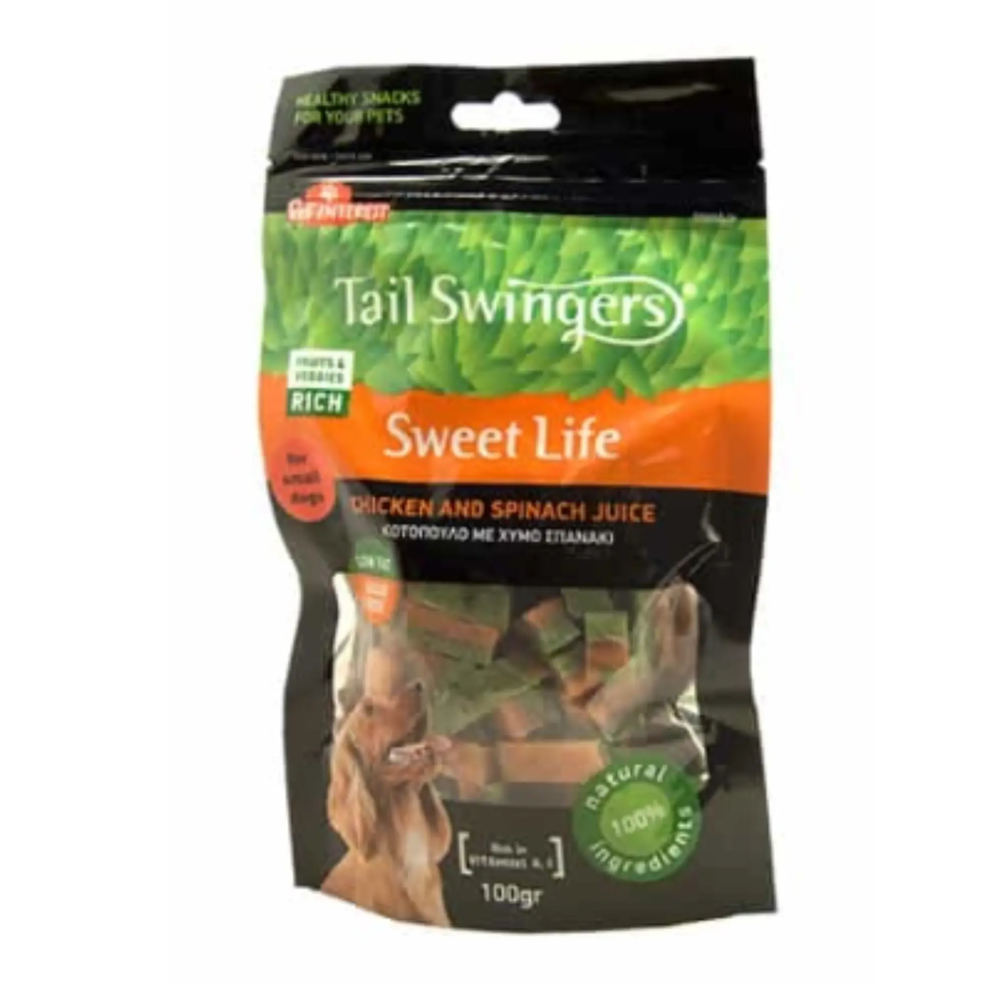 Tailswingers Spinach with Chicken խորտիկը համեղ և օգտակար ընտրություն է ձեր շան համար։ Պատրաստված է սպանախի խյուսից և նուրբ հավի ֆիլեից՝ ապահովելով բարձր սննդարար արժեք և հեշտ մարսելիություն։