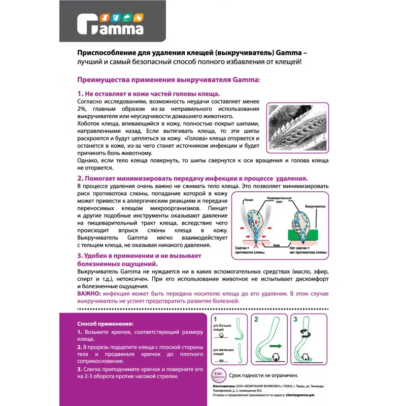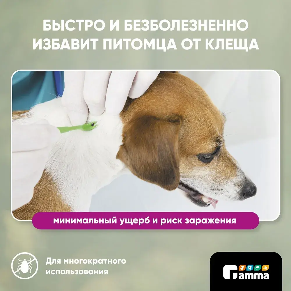 Это уникальное средство для многократного использования, которое помогает безболезненно избавить питомца от клеща. Изделие представляет собой пластиковый крючок с двумя зубцами, которые эффективно захватывают клеща, не сдавливая его в отличие от пинцета, что позволяет минимизировать ущерб и снизить риск заражения животного.
