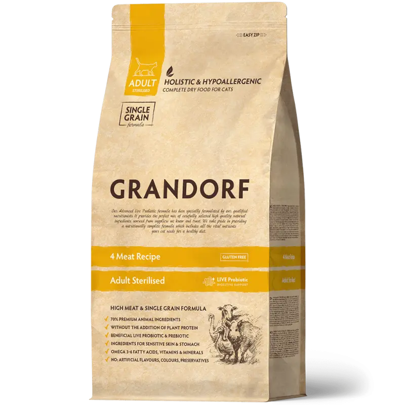 🐱🔒Grandorf Sterilized — сбалансированный сухой корм для стерилизованных кошек, кастрированных котов от 1 года и пожилых питомцев с чувствительным пищеварением или склонных к аллергии.