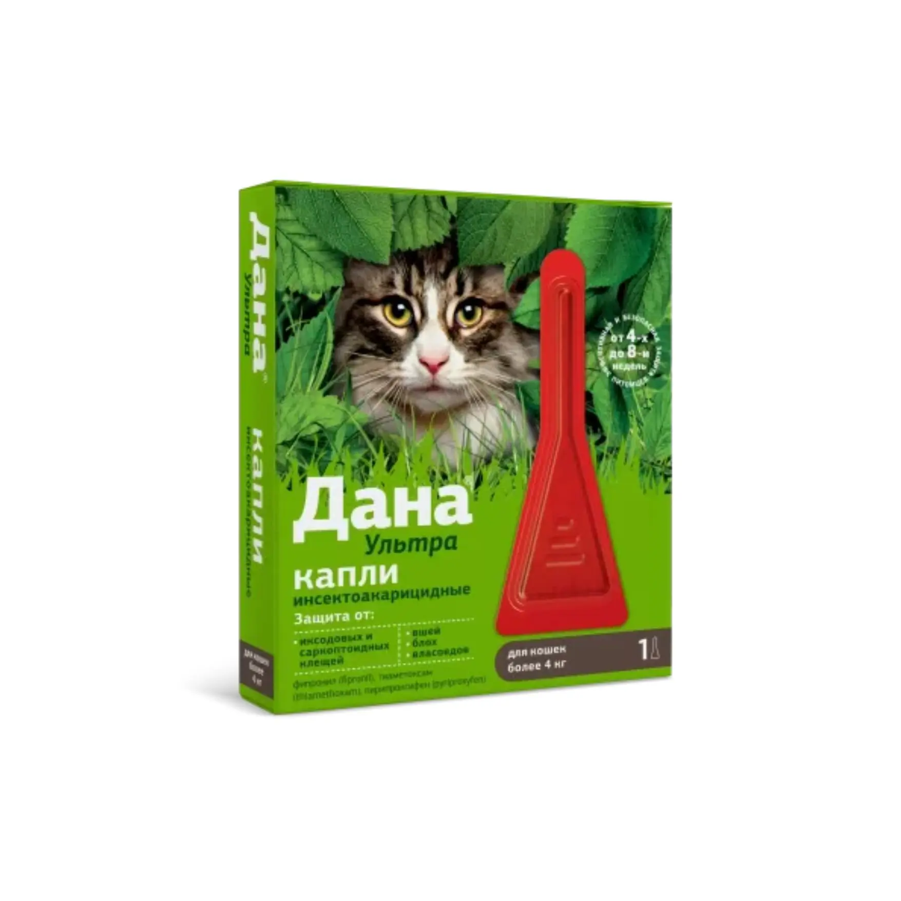 Капли Дана Ультра предназначены для кошек весом более 4 кг и эффективно борются с эктопаразитами. Средство обеспечивает защиту от блох, клещей, вшей и власоедов, а также прерывает их цикл развития.