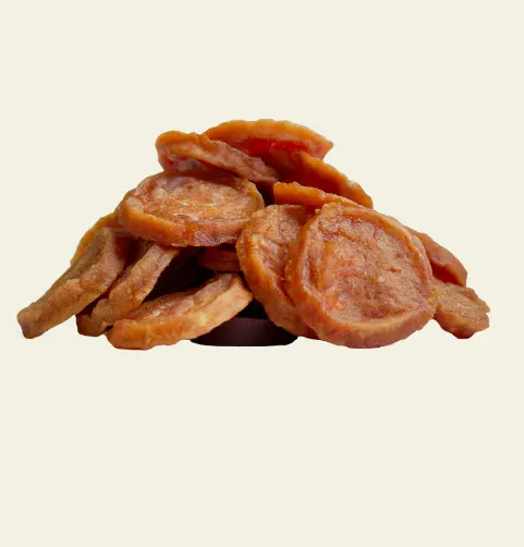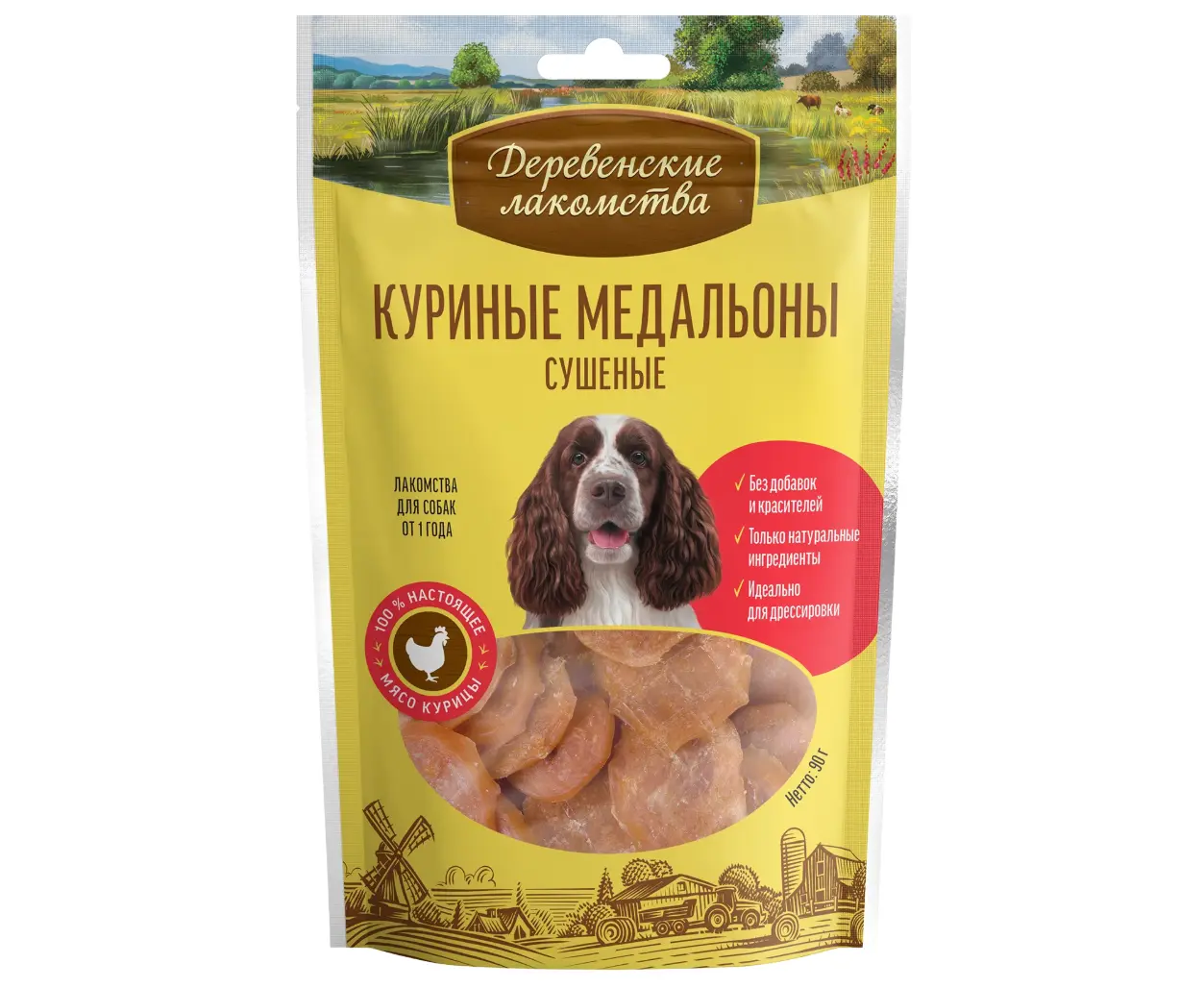 Медальоны из серии «Деревенские Лакомства» изготовлены из высококачественного куриного филе методом бережной сушки, что сохраняет все полезные свойства мяса 🥩. Форма медальона позволяет легко делить лакомство на части или давать целиком. Не содержит искусственных ароматизаторов и красителей 🌿. Упаковка 90г сохраняет свежесть продукта и удобна для использования дома или на прогулке.