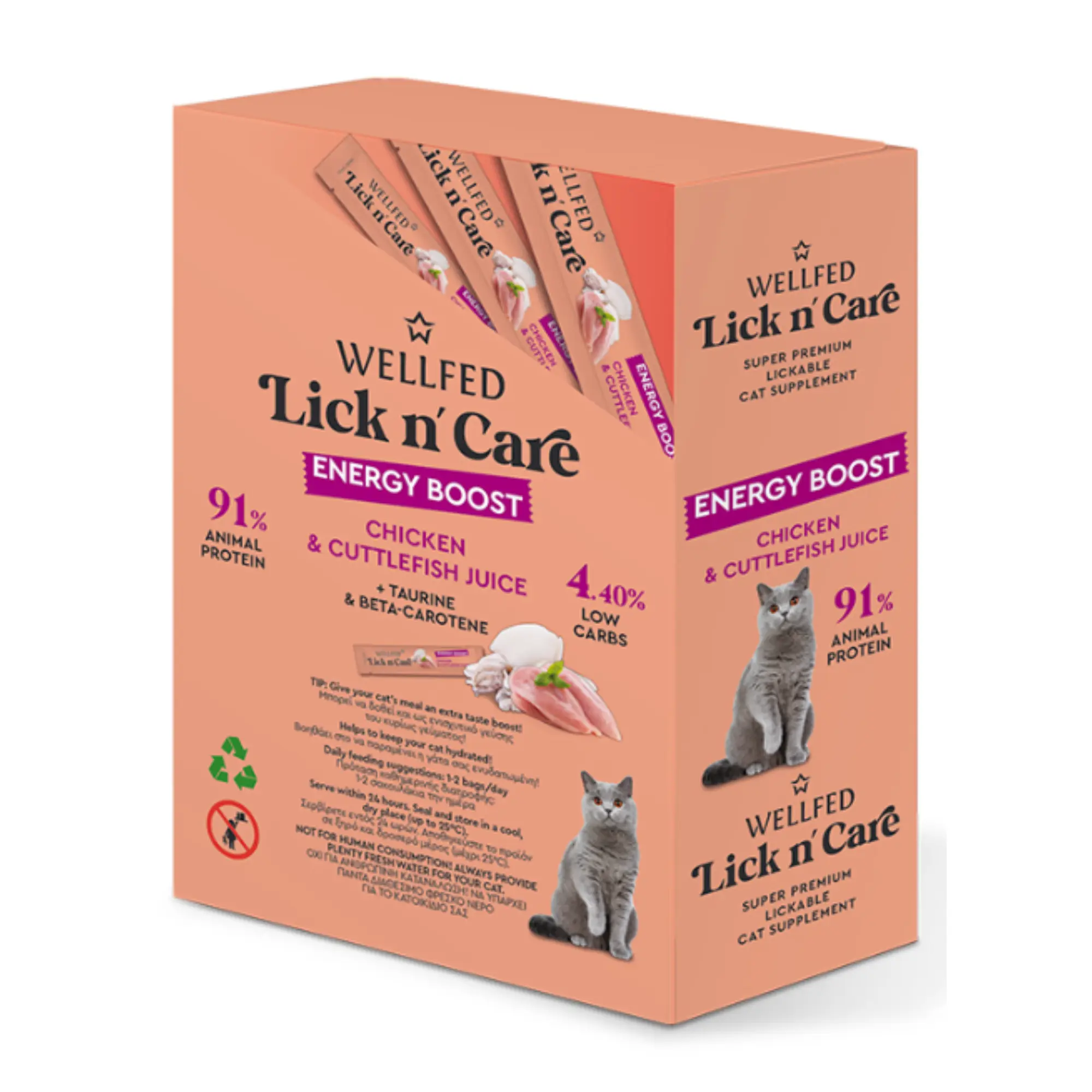 WELLFED Lick N' Care Energy Boost — это специальное лизательное лакомство для кошек, разработанное для повышения уровня энергии и активности 🐾⚡