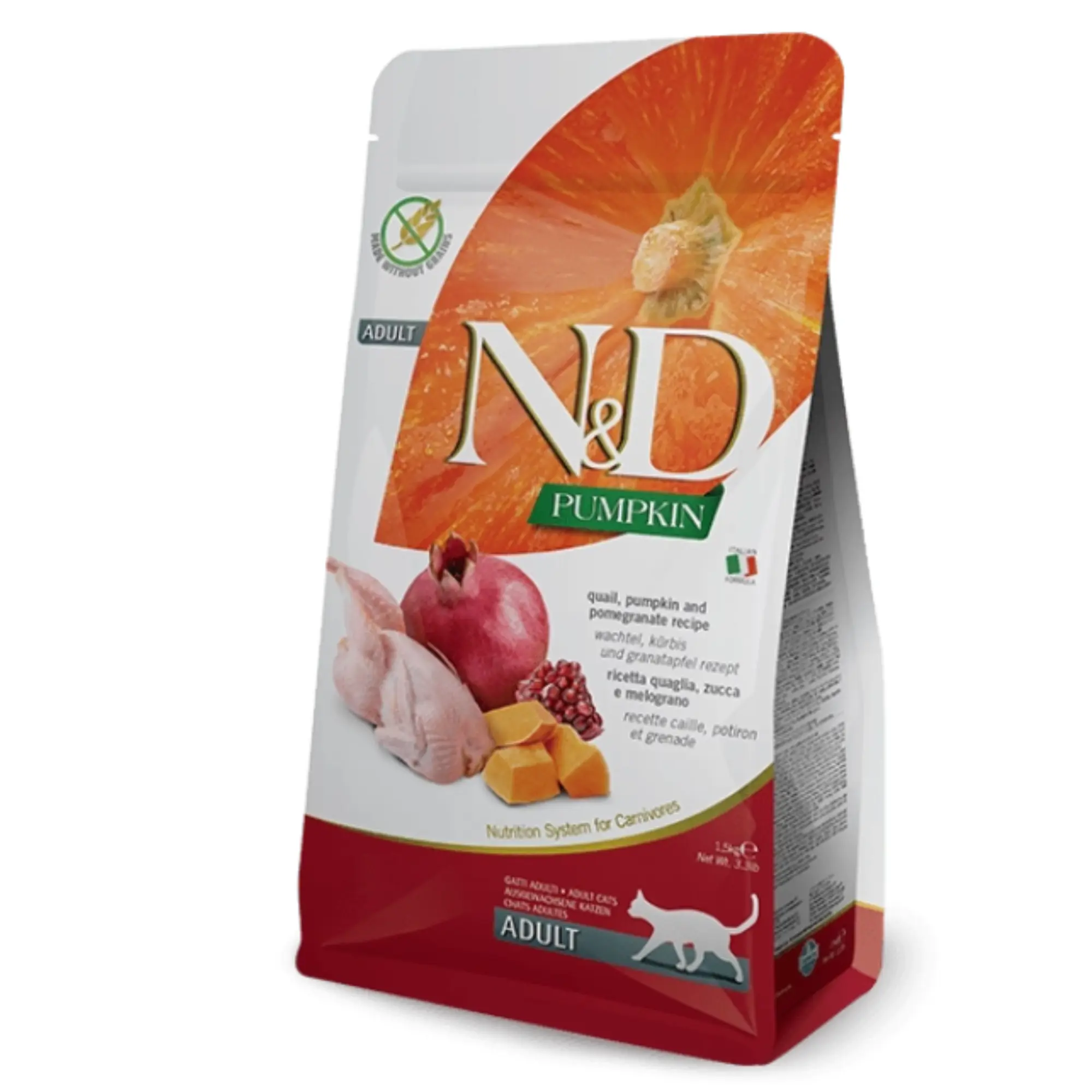 N&D Quail, Pumpkin & Pomegranate — полноценный сухой корм для взрослых кошек. Сбалансированная формула содержит большое количество животного белка и натуральные ингредиенты, поддерживающие здоровье пищеварительной системы, кожи и шерсти.
