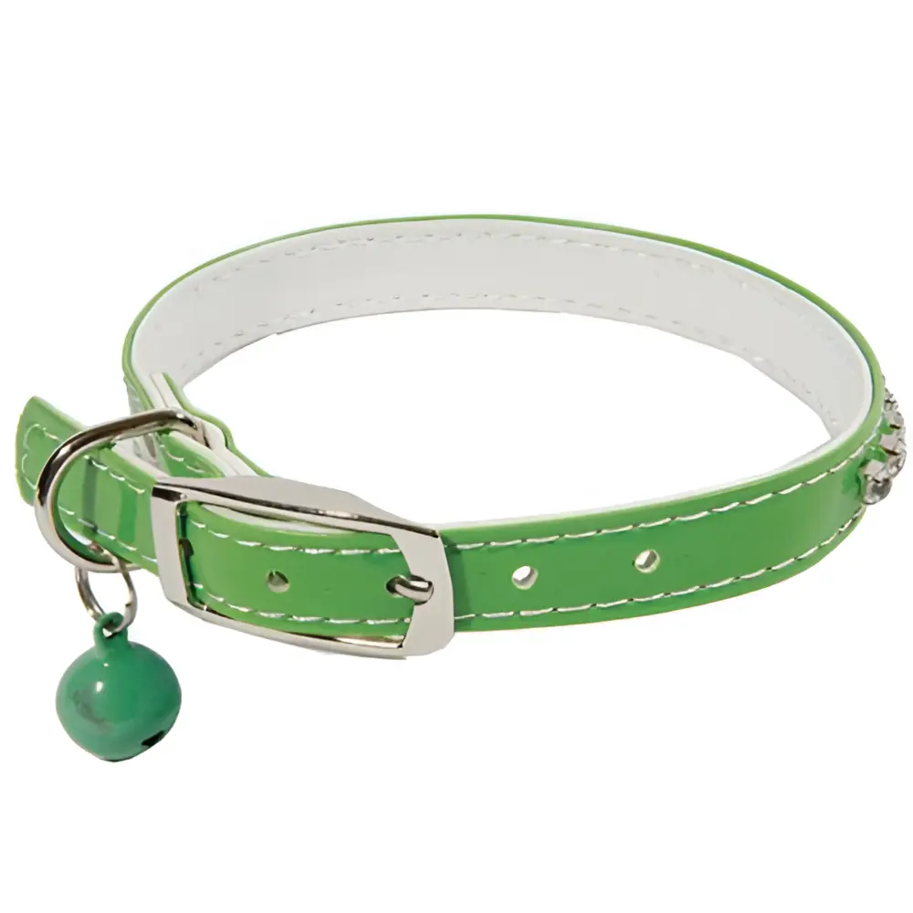 Ошейник для кошки "Синтетик" изготовлен из искусственной кожи, украшен стразами и дополнен колокольчиком. Воротник застегивается на металлическую пряжку. Звонок позволит контролировать местонахождение кошки, а также защитит уличных птиц от нежелательного контакта.